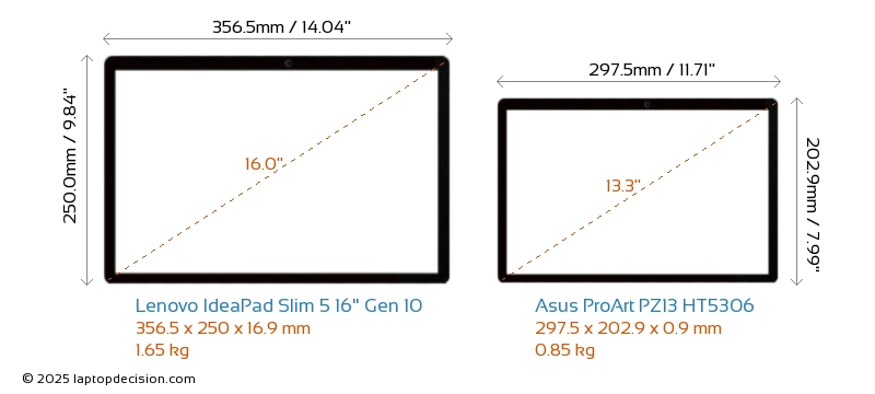 HDMI IdeaPad Slim 5 16" Gen 10 features an HDMI port (1x HDMI 1.4) for connecting to external monitors. ProArt PZ13 HT5306 does not have an HDMI port.