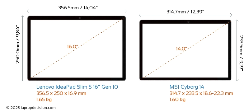 HDMIBoth IdeaPad Slim 5 16" Gen 10 and Cyborg 14 feature an HDMI port. IdeaPad Slim 5 16" Gen 10 offers 1x HDMI 1.4, while Cyborg 14 offers 1x HDMI 2.1.