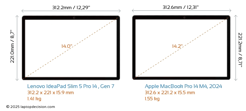 HDMIBoth IdeaPad Slim 5 Pro 14 , Gen 7 and MacBook Pro 14 M4, 2024 feature an HDMI port. IdeaPad Slim 5 Pro 14 , Gen 7 offers 1x HDMI 2.0, while MacBook Pro 14 M4, 2024 offers 1x HDMI 2.1.