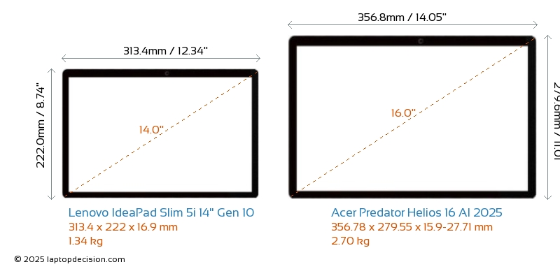 USBBoth IdeaPad Slim 5i 14" Gen 10 and Predator Helios 16 AI 2025 have USB-A ports. IdeaPad Slim 5i 14" Gen 10 has 2x USB 3.2 USB-A ports, while Predator Helios 16 AI 2025 has 3x USB 3.2 USB-A ports.Both IdeaPad Slim 5i 14" Gen 10 and Predator Helios 16 AI 2025 have USB Type-C ports. IdeaPad Slim 5i 14" Gen 10 has 2x USB 3.2 USB Type-C ports, while Predator Helios 16 AI 2025 has 2x USB 4.0 USB Type-C ports.