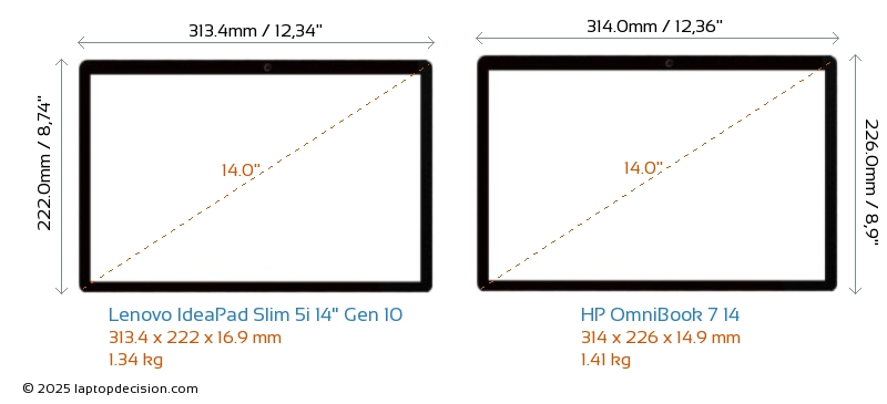 HDMIBoth IdeaPad Slim 5i 14" Gen 10 and OmniBook 7 14 feature an HDMI port. IdeaPad Slim 5i 14" Gen 10 offers 1x HDMI 1.4, while OmniBook 7 14 offers 1x HDMI 2.1.