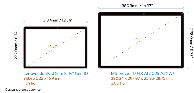HDMIBoth IdeaPad Slim 5i 14" Gen 10 and Vector 17 HX AI 2025 A2XWJ feature an HDMI port. IdeaPad Slim 5i 14" Gen 10 offers 1x HDMI 1.4, while Vector 17 HX AI 2025 A2XWJ offers 1x HDMI 2.1.