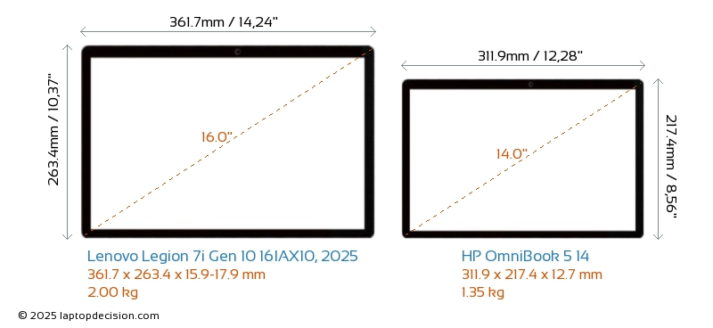 HDMI Legion 7i Gen 10 16IAX10, 2025 features an HDMI port (1x HDMI 2.1) for connecting to external monitors. OmniBook 5 14 does not have an HDMI port.