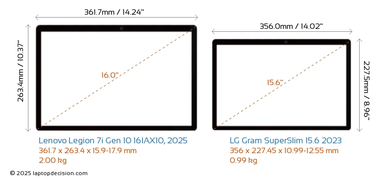 HDMI Legion 7i Gen 10 16IAX10, 2025 features an HDMI port (1x HDMI 2.1) for connecting to external monitors. Gram SuperSlim 15.6 2023 does not have an HDMI port.