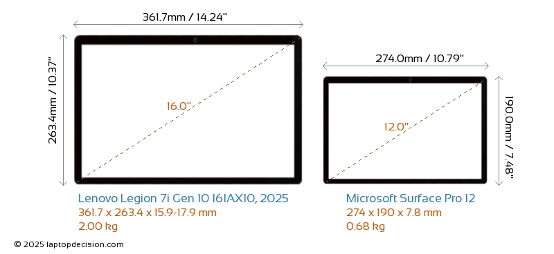 HDMI Legion 7i Gen 10 16IAX10, 2025 features an HDMI port (1x HDMI 2.1) for connecting to external monitors. Surface Pro 12 does not have an HDMI port.