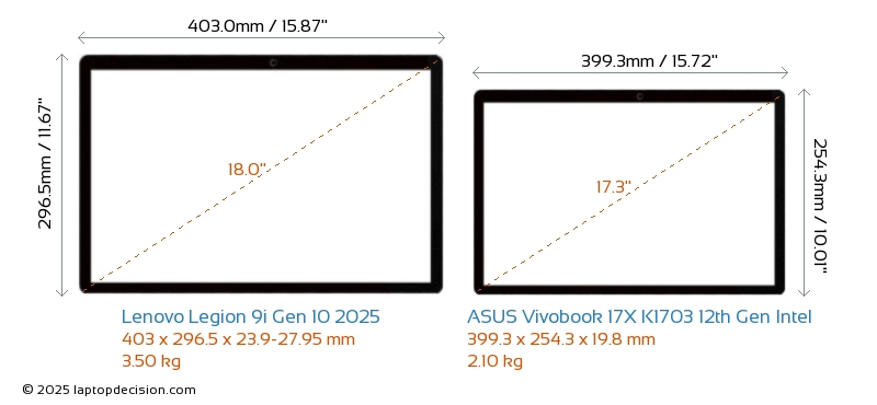 USBBoth Legion 9i Gen 10 2025 and Vivobook 17X K1703 12th Gen Intel have USB-A ports. Legion 9i Gen 10 2025 has 3x USB 3.2 USB-A ports, while Vivobook 17X K1703 12th Gen Intel has 2x USB 3.2 USB-A ports.Both Legion 9i Gen 10 2025 and Vivobook 17X K1703 12th Gen Intel have USB Type-C ports. Legion 9i Gen 10 2025 has 3x USB 4.0 USB Type-C ports, while Vivobook 17X K1703 12th Gen Intel has 1x USB 3.2 USB Type-C ports.