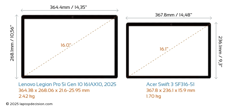 Wifi Legion Pro 5i Gen 10 16IAX10, 2025 features a more advanced Wi-Fi standard v7, providing faster and more reliable wireless connections compared to Swift 3 SF316-51 (v6).