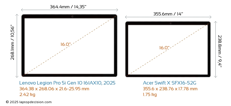 Audio JackBoth Legion Pro 5i Gen 10 16IAX10, 2025 and Swift X SFX16-52G are equipped with a 3.5mm Audio Jack, providing seamless connection to headphones and speakers.