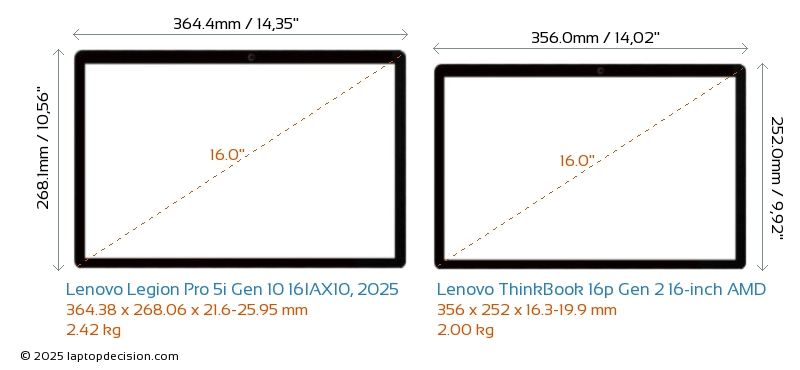HDMI Legion Pro 5i Gen 10 16IAX10, 2025 features an HDMI port (1x HDMI 2.1) for connecting to external monitors. ThinkBook 16p Gen 2 16-inch AMD does not have an HDMI port.