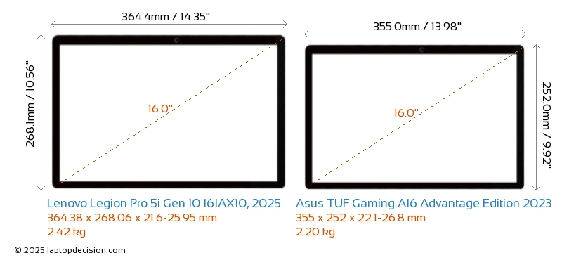 USBBoth Legion Pro 5i Gen 10 16IAX10, 2025 and TUF Gaming A16 Advantage Edition 2023 have USB-A ports. Legion Pro 5i Gen 10 16IAX10, 2025 has 3x USB 3.2 USB-A ports, while TUF Gaming A16 Advantage Edition 2023 has 2x USB 3.2 USB-A ports.Both Legion Pro 5i Gen 10 16IAX10, 2025 and TUF Gaming A16 Advantage Edition 2023 have USB Type-C ports. Legion Pro 5i Gen 10 16IAX10, 2025 has 2x USB 4.0 USB Type-C ports, while TUF Gaming A16 Advantage Edition 2023 has 2x USB 3.2 USB Type-C ports.
