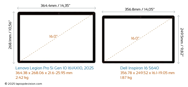 USBBoth Legion Pro 5i Gen 10 16IAX10, 2025 and Inspiron 16 5640 have USB-A ports. Legion Pro 5i Gen 10 16IAX10, 2025 has 3x USB 3.2 USB-A ports, while Inspiron 16 5640 has 2x USB 3.2 USB-A ports.Both Legion Pro 5i Gen 10 16IAX10, 2025 and Inspiron 16 5640 have USB Type-C ports. Legion Pro 5i Gen 10 16IAX10, 2025 has 2x USB 4.0 USB Type-C ports, while Inspiron 16 5640 has 1x USB 3.2 USB Type-C ports.