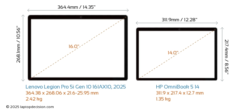 HDMI Legion Pro 5i Gen 10 16IAX10, 2025 features an HDMI port (1x HDMI 2.1) for connecting to external monitors. OmniBook 5 14 does not have an HDMI port.