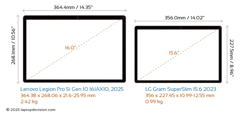 HDMI Legion Pro 5i Gen 10 16IAX10, 2025 features an HDMI port (1x HDMI 2.1) for connecting to external monitors. Gram SuperSlim 15.6 2023 does not have an HDMI port.