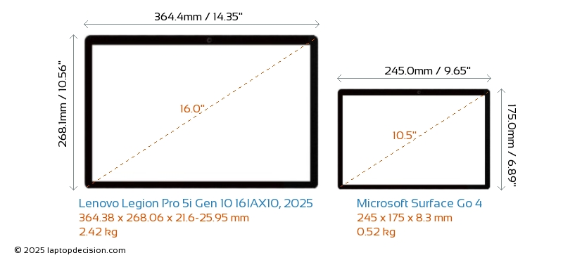 HDMI Legion Pro 5i Gen 10 16IAX10, 2025 features an HDMI port (1x HDMI 2.1) for connecting to external monitors. Surface Go 4 does not have an HDMI port.
