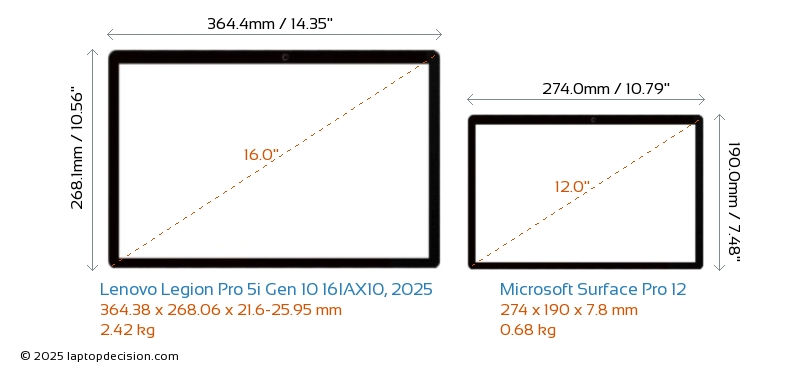 HDMI Legion Pro 5i Gen 10 16IAX10, 2025 features an HDMI port (1x HDMI 2.1) for connecting to external monitors. Surface Pro 12 does not have an HDMI port.