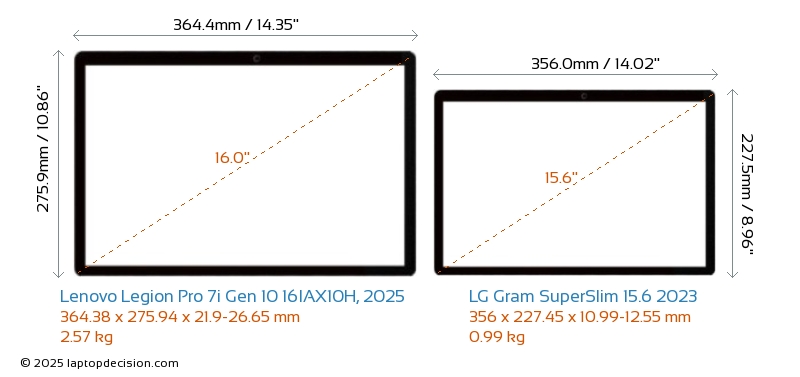 HDMI Legion Pro 7i Gen 10 16IAX10H, 2025 features an HDMI port (1x HDMI 2.1) for connecting to external monitors. Gram SuperSlim 15.6 2023 does not have an HDMI port.