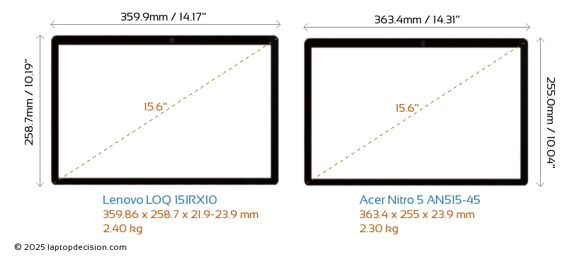 HDMIBoth LOQ 15IRX10 and Nitro 5 AN515-45 feature an HDMI port. LOQ 15IRX10 offers 1x HDMI 2.1, while Nitro 5 AN515-45 offers 1x HDMI 2.0.