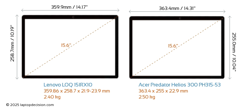 HDMIBoth LOQ 15IRX10 and Predator Helios 300 PH315-53 feature an HDMI port. LOQ 15IRX10 offers 1x HDMI 2.1, while Predator Helios 300 PH315-53 offers 1x HDMI 2.0.