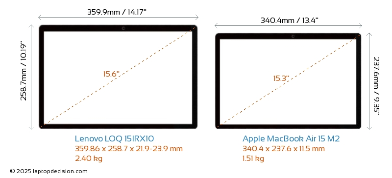 Thunderbolt MacBook Air 15 M2 is equipped with Thunderbolt 3 port. LOQ 15IRX10 does not have Thunderbolt port.