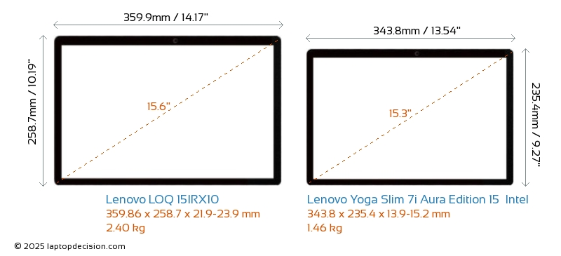 USBBoth LOQ 15IRX10 and Yoga Slim 7i Aura Edition 15 Intel have USB-A ports. LOQ 15IRX10 has 3x USB 3.2 USB-A ports, while Yoga Slim 7i Aura Edition 15 Intel has 1x USB 3.2 USB-A ports.Both LOQ 15IRX10 and Yoga Slim 7i Aura Edition 15 Intel have USB Type-C ports. LOQ 15IRX10 has 1x USB 3.2 USB Type-C ports, while Yoga Slim 7i Aura Edition 15 Intel has 2x USB 4.0 USB Type-C ports.