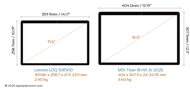 USBBoth LOQ 15IRX10 and Titan 18 HX AI 2025 feature 3x USB 3.2 USB-A ports.Both LOQ 15IRX10 and Titan 18 HX AI 2025 have USB Type-C ports. LOQ 15IRX10 has 1x USB 3.2 USB Type-C ports, while Titan 18 HX AI 2025 has 2x USB 4.0 USB Type-C ports.
