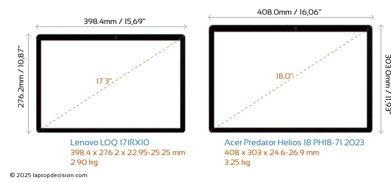 USBBoth LOQ 17IRX10 and Predator Helios 18 PH18-71 2023 have USB-A ports. LOQ 17IRX10 has 4x USB 3.2 USB-A ports, while Predator Helios 18 PH18-71 2023 has 3x USB 3.2 USB-A ports.Both LOQ 17IRX10 and Predator Helios 18 PH18-71 2023 have USB Type-C ports. LOQ 17IRX10 has 1x USB 3.2 USB Type-C ports, while Predator Helios 18 PH18-71 2023 has 2x USB 4.0 USB Type-C ports.