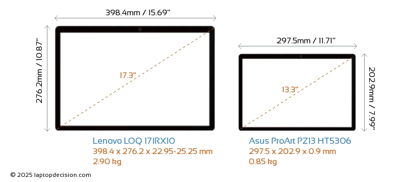 HDMI LOQ 17IRX10 features an HDMI port (1x HDMI 2.1) for connecting to external monitors. ProArt PZ13 HT5306 does not have an HDMI port.