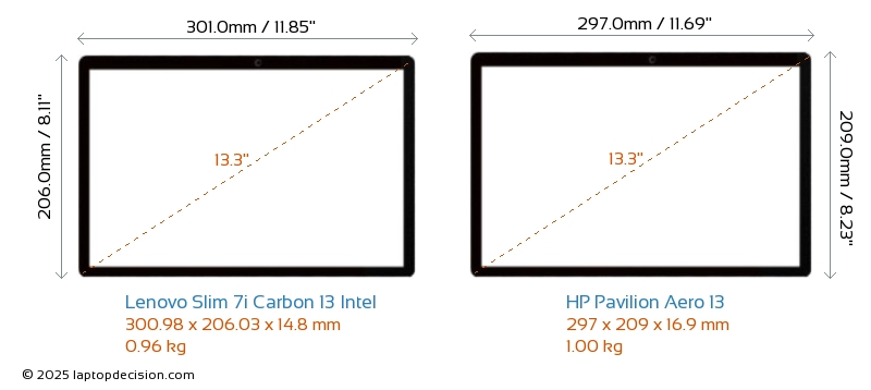HDMI Pavilion Aero 13 features an HDMI port (1x HDMI 2.0) for connecting to external monitors. Slim 7i Carbon 13 Intel does not have an HDMI port.