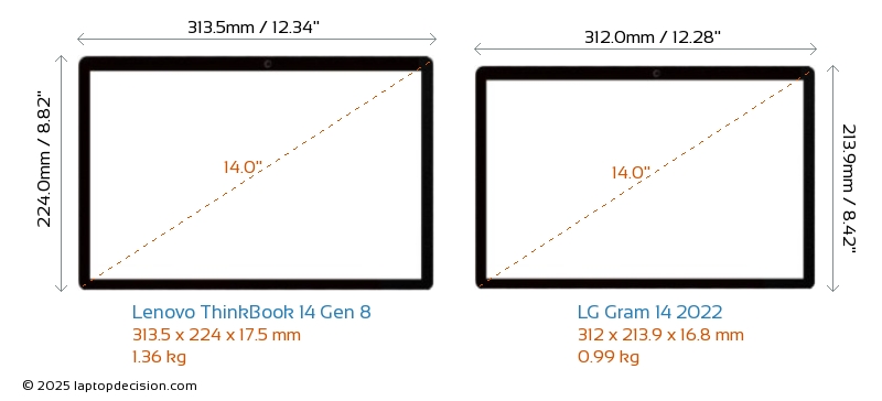 HDMIBoth ThinkBook 14 Gen 8 and Gram 14 2022 feature an HDMI port. ThinkBook 14 Gen 8 offers 1x HDMI 2.1, while Gram 14 2022 offers 1x HDMI 2.0.