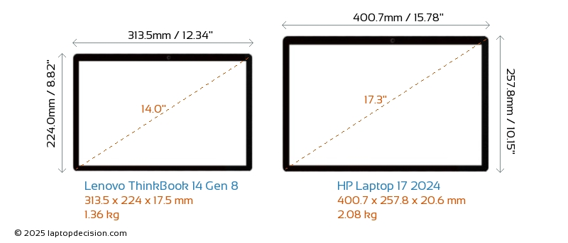 HDMIBoth ThinkBook 14 Gen 8 and Laptop 17 2024 feature an HDMI port. ThinkBook 14 Gen 8 offers 1x HDMI 2.1, while Laptop 17 2024 offers 1x HDMI 1.4.