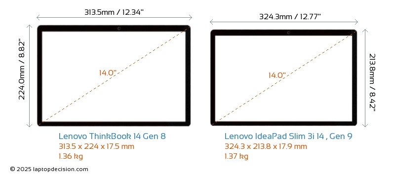 HDMIBoth ThinkBook 14 Gen 8 and IdeaPad Slim 3i 14 , Gen 9 feature an HDMI port. ThinkBook 14 Gen 8 offers 1x HDMI 2.1, while IdeaPad Slim 3i 14 , Gen 9 offers 1x HDMI 1.4.