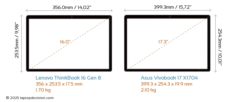 HDMIBoth ThinkBook 16 Gen 8 and Vivobook 17 X1704 feature an HDMI port. ThinkBook 16 Gen 8 offers 1x HDMI 2.1, while Vivobook 17 X1704 offers 1x HDMI 1.4.