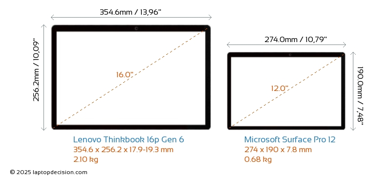 HDMI Thinkbook 16p Gen 6 features an HDMI port (1x HDMI 2.1) for connecting to external monitors. Surface Pro 12 does not have an HDMI port.