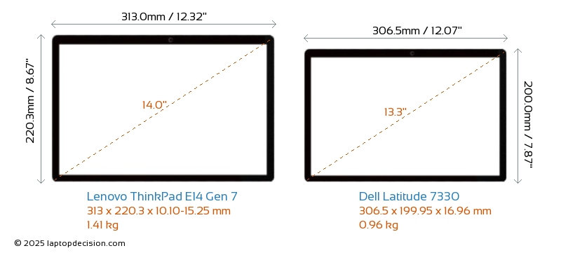 HDMIBoth ThinkPad E14 Gen 7 and Latitude 7330 feature an HDMI port. ThinkPad E14 Gen 7 offers 1x HDMI 2.1, while Latitude 7330 offers 1x HDMI 2.0.