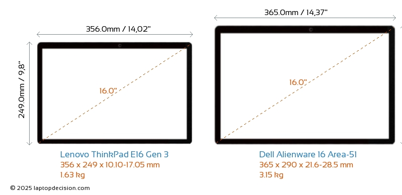 ThunderboltBoth ThinkPad E16 Gen 3 and Alienware 16 Area-51 feature Thunderbolt ports. ThinkPad E16 Gen 3 has Thunderbolt 4, while Alienware 16 Area-51 has Thunderbolt 5.