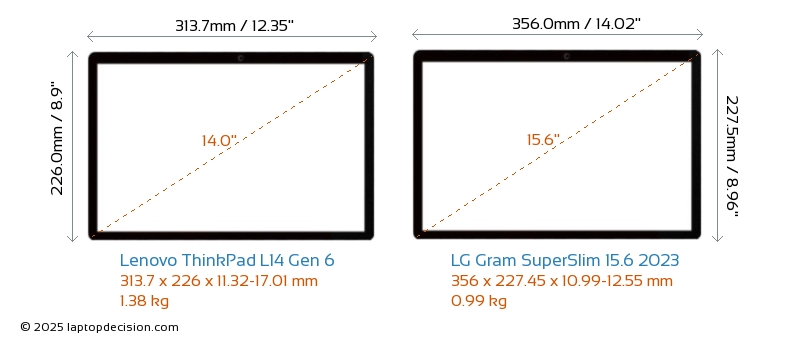 HDMI ThinkPad L14 Gen 6 features an HDMI port (1x HDMI 2.1) for connecting to external monitors. Gram SuperSlim 15.6 2023 does not have an HDMI port.