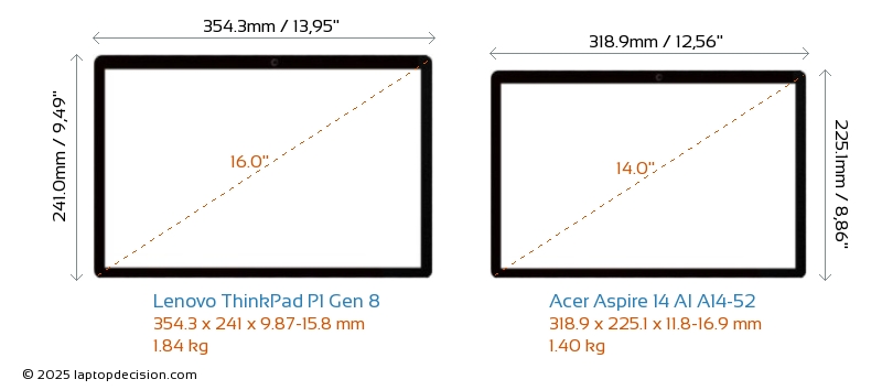Wifi ThinkPad P1 Gen 8 features a more advanced Wi-Fi standard v7, providing faster and more reliable wireless connections compared to Aspire 14 AI A14-52 (v6E).