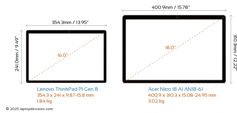 Wifi ThinkPad P1 Gen 8 features a more advanced Wi-Fi standard v7, providing faster and more reliable wireless connections compared to Nitro 18 AI AN18-61 (v6E).