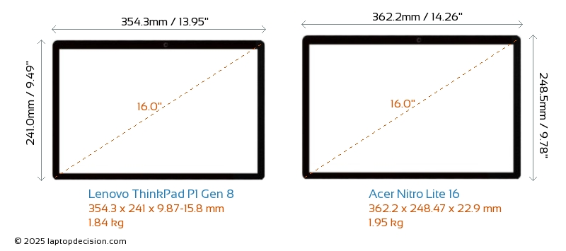 Wifi ThinkPad P1 Gen 8 features a more advanced Wi-Fi standard v7, providing faster and more reliable wireless connections compared to Nitro Lite 16 (v6).