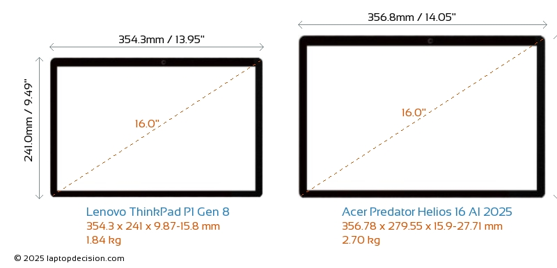 Audio JackBoth ThinkPad P1 Gen 8 and Predator Helios 16 AI 2025 are equipped with a 3.5mm Audio Jack, providing seamless connection to headphones and speakers.