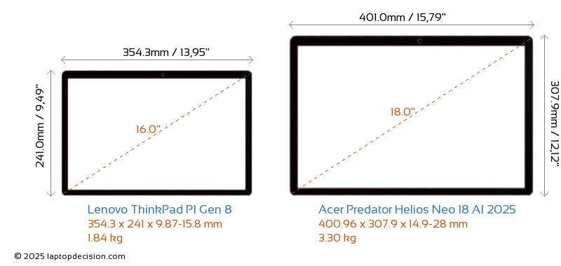Wifi ThinkPad P1 Gen 8 features a more advanced Wi-Fi standard v7, providing faster and more reliable wireless connections compared to Predator Helios Neo 18 AI 2025 (v6E).