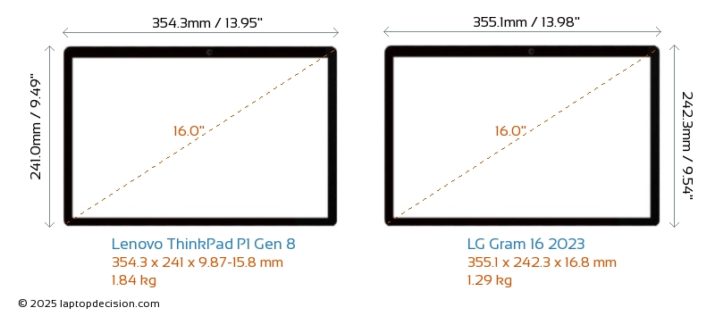 HDMIBoth ThinkPad P1 Gen 8 and Gram 16 2023 feature an HDMI port. ThinkPad P1 Gen 8 offers 1x HDMI 2.1, while Gram 16 2023 offers 1x HDMI 2.0.