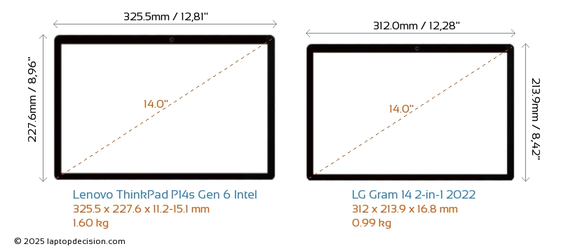 HDMIBoth ThinkPad P14s Gen 6 Intel and Gram 14 2-in-1 2022 feature an HDMI port. ThinkPad P14s Gen 6 Intel offers 1x HDMI 2.1, while Gram 14 2-in-1 2022 offers 1x HDMI 2.0.