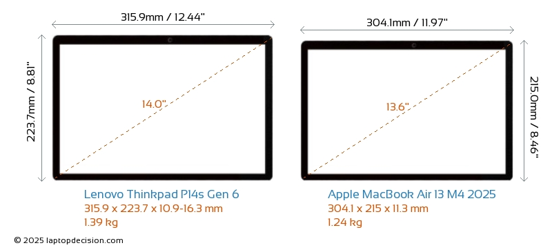 Audio JackBoth Thinkpad P14s Gen 6 and MacBook Air 13 M4 2025 are equipped with a 3.5mm Audio Jack, providing seamless connection to headphones and speakers.