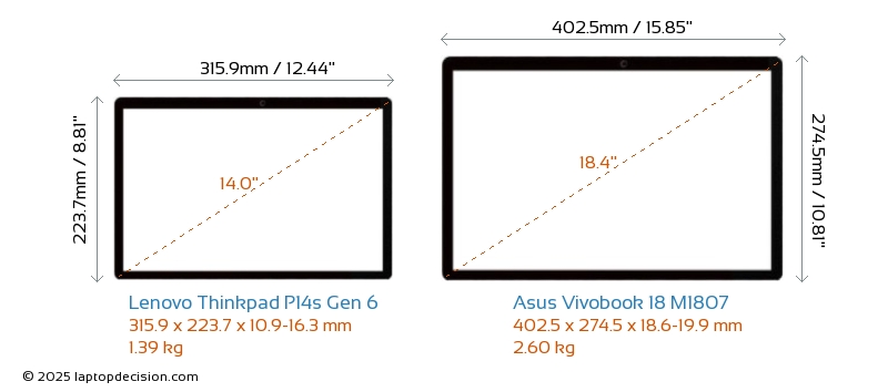 Thunderbolt Thinkpad P14s Gen 6 is equipped with Thunderbolt 4 port. Vivobook 18 M1807 does not have Thunderbolt port.
