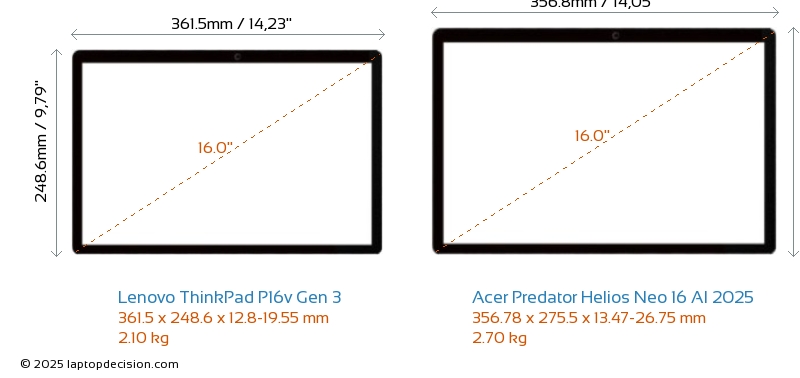 HDMIBoth ThinkPad P16v Gen 3 and Predator Helios Neo 16 AI 2025 feature an HDMI port (1x HDMI 2.1) for connecting to external monitors.