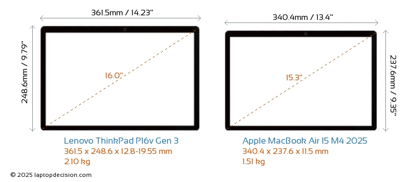 HDMI ThinkPad P16v Gen 3 features an HDMI port (1x HDMI 2.1) for connecting to external monitors. MacBook Air 15 M4 2025 does not have an HDMI port.
