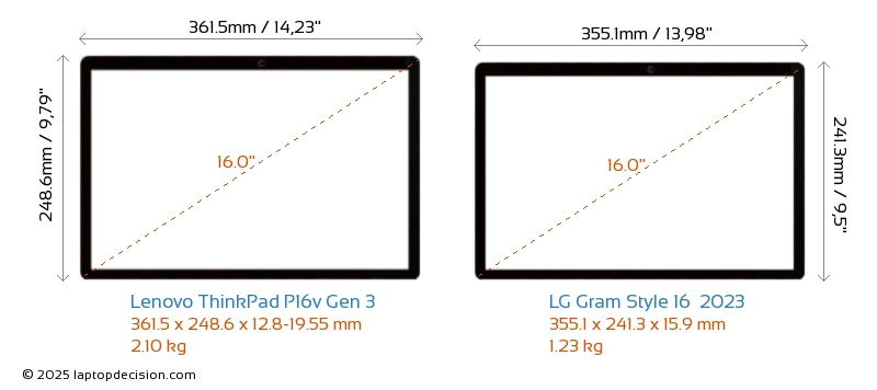 HDMI ThinkPad P16v Gen 3 features an HDMI port (1x HDMI 2.1) for connecting to external monitors. Gram Style 16 2023 does not have an HDMI port.