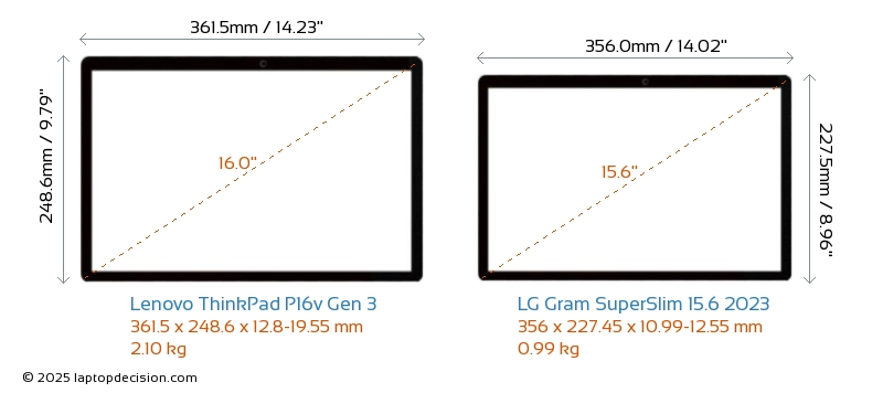 HDMI ThinkPad P16v Gen 3 features an HDMI port (1x HDMI 2.1) for connecting to external monitors. Gram SuperSlim 15.6 2023 does not have an HDMI port.