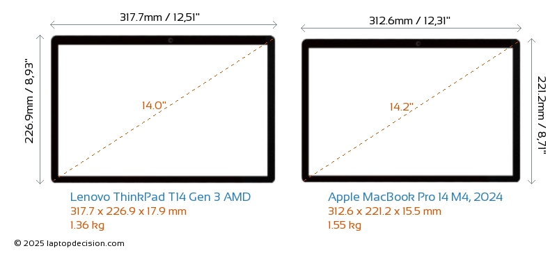 HDMIBoth ThinkPad T14 Gen 3 AMD and MacBook Pro 14 M4, 2024 feature an HDMI port. ThinkPad T14 Gen 3 AMD offers 1x HDMI 2.0, while MacBook Pro 14 M4, 2024 offers 1x HDMI 2.1.